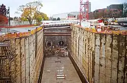 Preparation work for station construction began in January 2010, with the closure of East Denny Way and the installation of a construction wall around the site.[46] The 24-foot-high (7.3 m) wall was painted red and adorned with public artwork by local street artists over the course of the five-year construction period. Excavation of the station box began in July,[47][48] and reached the future platform level in December.[49] In June 2011, the first of three tunnel boring machines, named "Brenda", was launched from Capitol Hill toward Westlake station in Downtown Seattle.[50] A separate pair of machines, "Balto" and "Togo", were launched from University of Washington station at the same time and arrived at Capitol Hill station in March and April 2012.[51] Brenda completed the twin tunnels to downtown in May 2012.[52]