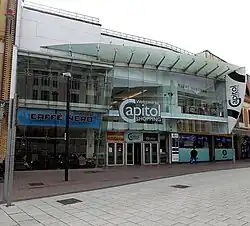 The Capitol Centre was opened in 1990, with attempts to replicate the original architecture. Ceramic tiles from the previous Victorian Dutch Cafe tearooms were incorporated on the eastern exterior.[3] The style of build dated very quickly and, in 1999, the centre underwent a £10 million redevelopment, which included the refurbishment of the pedestrian areas, the removal of the food court and new entrances into the centre (although much of the original external facade still remains). It was completed in November 1999.[4]
