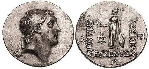 16. ^ a b Boyce, Mary; Grenet, Frantz (1991). A History of Zoroastrianism: Zoroastrianism Under Macedonian and Roman Rule. BRILL. pp. 267–8. ISBN 978-90-04-09271-6. The coins of Ariaramnes and Ariarathes III, with their mint-names and Greek lettering, have been taken to indicate a scattering of Greeks in the towns of south Cappadocia. ... His son Ariarathes IV (220–c.162), thus half-Macedonian by blood, set the title "king" on his coins, and attached to his name the cognomen Philopator. He also introduced the device of Athena holding Nike, which became the standard reverse type of the Ariarathid coinage. ... His son Ariarathes V (c.162–130), with the cognomen Eusebes, was an ardent philhellene, and no longer wears the tiara on any of his coins. In his youth he studied in Athens, where he became friends with the future Attalus III, the last king of Pergamum. He in his turn married a Seleucid princess, his cousin Nysa, daughter of Antiochus III; and he refounded Mazaka and Tyana as Greek poleis ...
