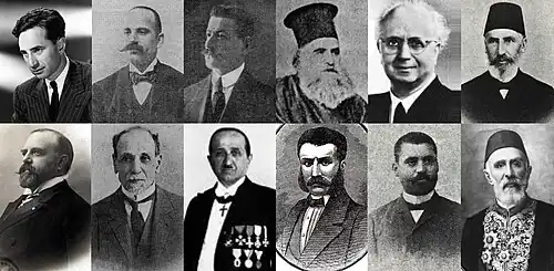 Twelve notable Cappadocian Greeks: (top row) Elia Kazan, Vasileios Stefanidis, Pantelis Georgiadis, Evgenios of Kayseri, Dimosthenis Daniilidis, Konstantinos Vagianis (bottom row) Ioannis Pesmazoglou, Pavlos Karolidis, Sofoklis Avraam Choudaverdoglou-Theodotos, Dimitrios Mavrofrydis, Ioakeim Valavanis, Georgios Georgiadis.