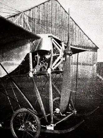 The Caproni Ca.11 was a high wing monoplane with a wooden structure and a canvas covering, equipped with a wing warping system to control the roll and reinforced by metal tie rods connected to the fuselage and to a special structure placed above it; the fuselage was based on a wooden lattice structure, in turn reinforced by metal cables, and was covered in cloth only for the front half; the same wooden structure with a canvas covering characterized the empennages. The trolley, fixed, was composed of two front wheels with anti-overblank pads and another smaller, tailed shoe. The Ca.11 differed from its immediate predecessors mainly for the engine, a French -made 7- cylinder star- shaped Gnome capable of developing a power of 50 hp.[1]
