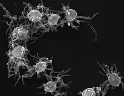 C. owczarzaki cells, in the filopodial stage, were described as 3 to 5 μm amoebas with a nucleus ⅓ - ½ of the diameter of the cell (containing a central nucleolus), long branched filopodia, mitochondria with flattened cristae, numerous phagosomes, lipid vacuoles, glycogen granules and a Golgi apparatus.[6][7] Cystic cells measure 4 to 5 μm with a double wall: the outer thin, irregular and loosely attached; and the inner thicker, smooth.[9]