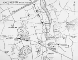 A section of infantry from the company to form the defensive flank along the southern edge, that did reach the strongpoint at the south-west corner, lost all but one man. Two platoons advanced along the north edge of the copse behind the creeping barrage and made it to the objective. After realising that they were isolated and in danger of being outflanked on the left, the platoons retired, captured a pillbox on the way and then setting up a post in Jasper Lane, where they were reinforced by two Vickers guns and the rest of the Queen's on the left, retreated close to the original front line.[28] During the day, the Germans retook the western edge and the blockhouse at the north-western corner; later British attempts to recapture the copse failed.[26]