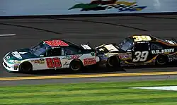 The first racing with the redesigned car was the 2011 Daytona 500 and its supporting races (Budweiser Shootout and Gatorade Duels), all held on brand new pavement for Daytona International Speedway. The Daytona 500 broke long-standing records for leaders and lead changes, as 22 drivers changed the lead 74 times. It also saw a first time winner, rookie Trevor Bayne, go to victory lane.[5] But the story of the new car was a phenomenon of lock-bumper superdrafts – two cars would literally lock together and push into a clear lead, with speeds up to 10 MPH faster than with a conventional draft (on numerous occasions 2-car superdrafts topped 206 MPH); this phenomenon had debuted at Talladega Superspeedway in the spring of 2008 when Denny Hamlin discovered he could push Kevin Harvick all the way around the track during practice, resulting in a lap time about a half a second faster than the rest of the field. Hamlin used the move multiple times in that race to get the lead, and by the next spring the technique was used by the majority of the field throughout the entire race. The phenomenon also led to a new level of "team" racing reminiscent of the team orders ethos common to Formula One; drivers would communicate with each other over radio to coordinate "swaps" instead of actually fighting for position. This was present in the 2011 Aaron's 499 at Talladega, leading to a three-wide finish with three drafting teams contending for the win: Clint Bowyer (pushed by Kevin Harvick), Jeff Gordon (who was being pushed by Mark Martin, but separated before the finish line), and winner Jimmie Johnson (pushed by Dale Earnhardt Jr.), who won by two-thousandths of a second over Bowyer. A fourth drafting team, consisting of Roush-Fenway teammates Carl Edwards and Greg Biffle (Biffle was pushing), squeezed in between the Bowyer/Harvick tandem and the wall, but only finishing 6th (Edwards) and 7th (Biffle).