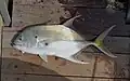 The species in the genus Caranx are all moderately large to very large fishes, growing from around 50 cm in length to a known maximum length of 1.7 m and 80 kg in weight; a size which is only achieved by the giant trevally, Caranx ignobilis, the largest species of Caranx.[15] In their general body profile, they are similar to a number of other jack genera, having a deep, compressed body with a dorsal profile more convex than the ventral.[16] The dorsal fin is in two parts, the first consisting of 8 spines and the second of one spine and between 16 and 25 soft rays. The anal fin has one or two detached anterior spines, with 1 spine and between 14 and 19 soft rays. The caudal fin is strongly forked. All species have moderate to very strong scutes on the posterior section of their lateral lines. All members of Caranx are all generally silver to grey in colour, with shades of blue or green dorsally, while some species have coloured spots on their flanks. Fin colours range from hyaline to yellow, blue and black.[16]