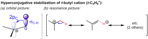 - tertiary cations are stable and many are directly observable in superacid media. The stabilization by alkyl groups is explained by hyperconjugation.[10] The donation of electron density from a β C-H or C-C bond into the unoccupied p orbital of the carbocation (a σCH/CC → p interaction) allows the positive charge to be delocalized.