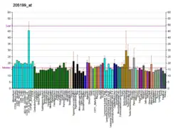 Expression of CA IX is primarily regulated at the transcriptional level.[17] The promoter region of the CA9 gene contains an HRE (hypoxia responsive element) where HIF-1 can bind, which allows hypoxic conditions to increase CA IX expression.[17] Expression can also be regulated post-translationally by metalloproteinases which cause shedding of the enzyme's ectodomain.[18] Unlike other CA isozymes, CA IX is not inhibited by high lactate concentrations.[19] However, it is inhibited by bicarbonate.[19]