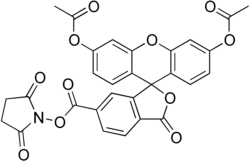 Carboxyfluorescein diacetate succinimidyl ester (CFDA-SE) is an amine-reactive, cell-permeable dye generally used in animal cell proliferation research. CFDA-SE is a modified CFSE with two hydroxyl groups on its fluorescein moiety replaced with acetates. This change renders the molecule more hydrophobic and cell-permeable at the expense of its fluorescence property. After entering cells by diffusion, CFDA-SE is cleaved by intracellular esterase enzymes to form CFSE. As its reactive succinimidyl ester group is unmodified, CFDA-SE also covalently binds to lysine residues and other amine sources like CFSE.