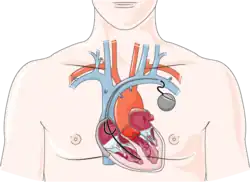 Medical illustration of a human heart that is being assisted by a pacemaker.