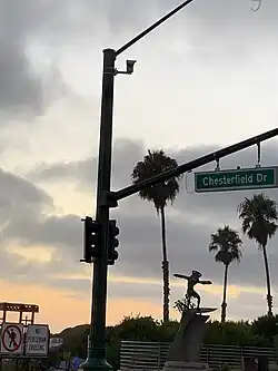 The sculpture began to attract pranksters who dressed the surfer in various attire, costumes, even with extended backdrops, which at times approached vandalism.[3][7] The list of such pranks is extensive, often coordinated with current events: a pink pleated skirt, bikini top and lucha libre wrestling mask;[15] a Zorro costume;[16] a pumpkin head (at Halloween);[16] a Santa Claus hat (at Christmas);[16] a full Uncle Sam costume for United States Independence Day;[16] the hood of the prisoner on a box photograph from Abu Ghraib prison;[10] a clown costume;[17] a loincloth and surrounded by a prehistoric setting while being snatched up by a sculpted pterodactyl in flight;[18] and a papier mâché statue of a shark about to swallow up the surfer from beneath.[5][7][16][17][19]