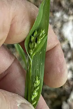 Carex albursina, commonly known as the White bear sedge or blunt-scaled wood sedge,[1] is a wide-leaved sedge that typically grows in moist deciduous or mixed woods in eastern North America.[2] It was named after White Bear Lake in east central Minnesota, where it was discovered by Edmund Sheldon in the 1890s.[3] The leaves are 10–38 mm (3⁄8–1+1⁄2 inches) wide and 10–35 cm (4–14 inches) long.[2]