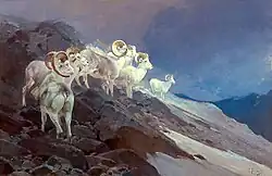 In 1910, Banff, Alberta tour guide Jimmy Simpson saw a reproduction of Rungius’s painting Wary Game, a painting of six Dall rams on a high spur of a wind-swept Yukon mountain ridge, in an issue of The Bulletin put out by the New York Zoological Society. Upon seeing the painting, Simpson declared “that fellow knows his animals and he knows his sheep.”[6] Simpson wrote Rungius a letter in which he extended a generous invitation; if Rungius could get to Banff, Simpson would take him out on a sheep hunt at no cost. In 1910, Rungius accepted an offer to visit the Canadian Rockies, and would go on to paint a large number of his paintings there. He enjoyed the opportunities for hunting, exploration, and sport to such an extent that 1921, he built a studio in Banff called "The Paintbox."[1] Rungius said that “I could not think of any more suitable place than Banff in Alberta. A province which has practically every species within its borders. Easy to reach and a cosmopolitan, broad-minded town right in the wilderness, at the same time offering all the comforts of a big city. My wife who had been with me here a couple of times also liked Banff and approved the idea.”[7] Rungius worked in his Banff studio from April to October every year until his death in 1959.[8]