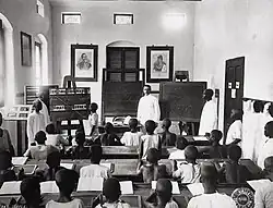 A photograph from a government school in 1903 depicts a German teacher and local pupils in a classroom, with blackboards for arithmetic instruction as well as reading and writing lessons in Swahili language, using Latin script that the Germans had introduced.[18][19]