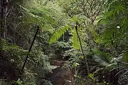 The park covers a steep and mountainous area with altitudes ranging from 50 to 975 metres (164 to 3,199 ft). Average temperatures are 19 °C (66 °F) with maximum temperature of 34 °C (93 °F). There may be frost in June and July, with light but persistent rainfall in the winter. Annual rainfall is from 1,475 to 2,189 millimetres (58.1 to 86.2 in), with the period from September to February having the most rain.[6] In the lower parts the average temperature is 22 °C (72 °F) and average annual rainfall is 1,600 millimetres (63 in).[7] There are many rivers and waterfalls.[3]