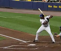 As a September call-up, he made his major league debut on October 1, 1993, drawing a walk in his first career plate appearance.[4][9] Though he didn't play in the 1993 postseason, in which the Blue Jays won the World Series, he was awarded a World Series ring.[10] Originally a catcher, Delgado played in left field for the Blue Jays in 1994 and 1995,[4] before switching to first base, where he became one of the most productive sluggers in the major leagues. Starting in 1997, he hit at least 30 home runs in ten consecutive seasons.[4] A two-time All-Star, in 2000 and 2003, Delgado holds several Blue Jays single-season and career records. He won the Hank Aaron and The Sporting News Player of the Year Awards in 2000, and the Silver Slugger Award in 1999, 2000, and 2003.