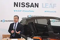 In 2007, Ghosn led the Renault–Nissan Alliance into the mass-market zero-emission electric car market in a major way, and committed €4 billion (more than $5 billion) to the effort.[74][75][76][77] In 2008, he confirmed that Nissan–Renault would bring an "entire lineup" of zero-emission electric cars to the worldwide market by 2012.[78][79] In 2009, he told the University of Pennsylvania's Wharton School of Business, "If you're going to let developing countries have as many cars as they want—and they're going to have as many cars as they want one way or another—there is absolutely no alternative but to go for zero emissions. And the only zero-emissions vehicle available today is electric ... So we decided to go for it."[80] The Nissan Leaf, an electric car billed as "the world's first affordable zero-emission car",[81][82] debuted in December 2010.[75] By 2017, the Renault–Nissan Alliance was the world leader in electric vehicles, selling more than twice as many electric cars as Tesla, and the Nissan Leaf was the world's best-selling electric vehicle by a wide margin.[83]