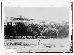 Maximilian and Charlotte arrived at the port of Veracruz on 28 May 1864 and made entry into Mexico City on 12 June with a warm welcome.[47][48] Unimpressed by the National Palace, which required major refurbishment, they preferred Chapultepec Castle as their new Imperial residence.[49] They also chose the Palace of Cortés in Cuernavaca as a summer residence. Shortly after their arrival in Mexico, they commenced costly improvements to their various properties and surroundings, despite the Mexican treasury being in a critical condition.[50] Charlotte took a leading role in the various festivals, military parades, balls and theatrical performances presented in their honour.[51] She also presided over the newly created Mexican Imperial Order of Saint Charles, or 'Orden Imperial de San Carlos', designed to reward charitable or other service to the Mexican nation.[52]