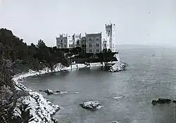 Charlotte and Maximilian therefore retired to Miramare Castle at one end of the Gulf of Trieste.[32] The construction of the castle continued throughout 1860, according to plans prepared by Maximilian and financed in part from Charlotte's dowry. Her brother, the future Leopold II, noted in his diary: "The construction of this palace in these days is a limitless madness".[33] In correspondence Charlotte painted an idyllic portrait of this time in Miramare, though the estrangement of the two spouses appeared to became more marked. Charlotte practiced horseback riding, painting and swimming. She played a major part in planning the layout and statuary of the extensive gardens of Miramare, while contributing some of her own paintings to the gallery of the palace.[34][35]