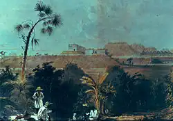 On 6 November 1865, Charlotte began an official visit to the remote province of Yucatán, which lasted almost two months. Without Maximilian, but accompanied by an imposing retinue, she departed on the Tabasco, a ship in poor condition whose pitching made the crossing of the Gulf of Mexico very difficult. Yucatán, far from the tragic events that bloodied the rest of Mexico, gave a relatively warm welcome to the Empress.[71] This trip commenced with a succession of festivities preceding her arrival in Mérida, capital of the province.[72] Charlotte then took the opportunity to visit the ruins of the ancient Maya city of Uxmal, where she admired the archaeological curiosities.[73] While there, she wrote a series of letters and reports on the peninsula that are now archived in the National Archives of Austria and the Library of Congress.[74] When Charlotte met Maximilian again in Cuernavaca, the day before New Year's Day 1866, he informed her of the new legislative projects he had conceived. Charlotte and her husband stayed for a few days in Cuernavaca, where on the morning of 6 January, she learned of the death of her father King Leopold I of Belgium almost four weeks before.[75] Two months later, on 24 March, Charlotte heard that her maternal grandmother Maria Amalia, Dowager Queen consort of the French; to whom she was deeply attached, had died in England.[76]