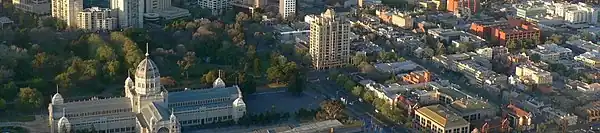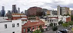 As of 2021, apartments (80.7%) remain the most common form of housing.[12] Carlton's apartments are low incomes, including crisis and student accommodation, with Housing Commission of Victoria towers and modern student apartment buildings. The two main housing commission estates are between Lygon and Rathdowne Streets, and between Nicholson and Canning Streets. These are configured as a mixture of 4 and 5-storey walk-up flats and 22-storey high-rise towers which are in the process of being redeveloped as mixed-tenure housing. 72.3% of Carlton's housing is rented,[12] the vast majority of which is concentrated in these apartment towers. The development of new apartment buildings to accommodate international student market since the late 1990s has transformed the once low-rise skyline of Swanston Street, so that its predominant height is about 10–11 storeys. Some strata-titled apartments are clustered fronting suburb's parks and gardens.