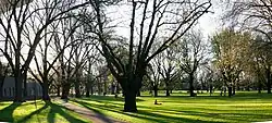 In the 1960s, the residents in some parts of the suburb were forced to move from their homes due to redevelopment by the Housing Commission of Victoria. Despite that, a number of areas in Carlton have survived intact.[6][7] In the 1970s, Carlton was the site of three trade union green bans. One related to an abandoned block where a developer wanted a warehouse but local residents wanted a park, now the Hardy-Gallagher Reserve (named after Labor councillor Fred Hardy and union leader Norm Gallagher).[8] Another allowed a vacant lot in Cardigan street to be turned into a park, and another saved a number of terraced houses from demolition.[9]