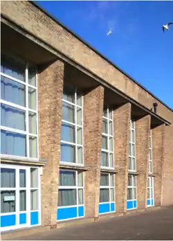 Demanding £173,793, construction of a new grammar school began in 1952.[7][12] The building was designed by County Architect E. W. Roberts to comfortably accommodate 540 pupils, anticipating that a sixth form would be established as its pupils matured.[8][7] Architectural historian Elain Harwood demonstrates that Roberts repeated the same design at other schools both before Carlton le Willows' foundation and until his retirement in December 1954, describing its "strong proportions and blonde brickwork" as "impressive".[7] In-line with Roberts' formula, generous acreage, permitting a large playing field, was secured for Carlton le Willows that year with the County Council's acquisition of War Department land once allotted to the adjacent Gedling House, which was built for the Smith banking family in the late 18th to early 19th–century.[13][7]