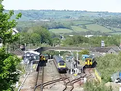 Carmarthen railway station is a stop on the West Wales Line, serving the town of Carmarthen, Wales. It is sited south of the River Towy, 245 miles 55 chains (395.4 km) from London Paddington, on the route via Stroud.[1] The station is operated by Transport for Wales, which operates the majority of services; Great Western Railway also runs a limited service to London Paddington.