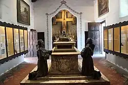 In December 1771, a stockade of approximately 130x200 [what?] became the new Mission Carmel. Simple buildings of plastered mud were the first church and dwellings until a structure was built of wood from nearby pine and cypress trees to last through the seasonal rains. This too, was a temporary church until a permanent stone edifice was built.[11] In 1784, Serra died and was buried, at his request, at the Mission in the Sanctuary of the San Carlos Church, next to Crespí, who had died the previous year. Serra was buried with full military honors.[11] Carmel Mission contains the state's first library.[12]