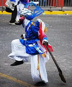 One of the largest of this type of Carnival is the Carnival of Huejotzingo, Puebla in which over 2,000 people participate. Participants divide into four battalions, identified by costume. From the first day, the air is filled with the sounds of blanks being fired as mock battles among the battalions are enacted with fake guns using real gunpowder. The inspiration for much of the dance is the Battle of Puebla with Mexicans and French represented but it is not historically accurate. Also part of the festivities are the reenactment of two stories, one of the kidnapping of the mayor's daughter and one depicting the first Christian marriage in Mexico.[6][35] Another significant Carnival event in the state is in Tehuacán where masked men called Huegues whip themselves in preparation for Lent.[9]