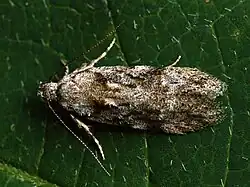 The wingspan is 11–15 mm. The head is whitish, grey sprinkled. Terminal joint of palpi longer than second. Forewings are grey, irrorated with blackish; suffused blackish spots on costa near base and before and beyond middle; a blackish streak along fold, sometimes interrupted into two or three spots; two black dots transversely placed in disc at 2/3; a pale angulated fascia at 3/4 sometimes indicated by darker anterior suffusion. Hindwings are grey. The larva is light green, above reddish-tinged; dots black; head and plate of 2 light brown.[5][6][7][8]