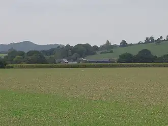 The ruins of Carreghofa Castle were rediscovered in 1871, when workers uncovered an underground room and perimeter stone foundations.[3] Subsequently reburied, the prominent earthworks are all that remain of the old castle structure.[4] A 17th-century farm complex, Carreghofa Hall, is believed to be built directly above the old castle and is designated a Grade II listed building.[1]