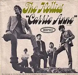 "Carrie Anne" is a song written by Allan Clarke, Graham Nash, and Tony Hicks and released by British pop rock group the Hollies. It was recorded on 1 May 1967 and was released as a single in the same month by Parlophone Records in the United Kingdom and Epic Records in the United States. It became a hit in 1967, reaching No.3 on the UK Singles Chart. It was also a hit in the US and Canada, peaking at No.9 on both pop charts. It also reached No.4 in the Irish charts.
