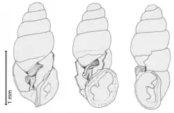 The shell is 1.8-2.3 mm high x 0.8-0.9mm. wide. The shell is more slender than that of Carychium minimum. If the last whorl above the aperture is opened this shows the parietalis (a spiral ridge on the parietal region projecting into the interior of the shell) descending in a characteristic double curve (see figure below).