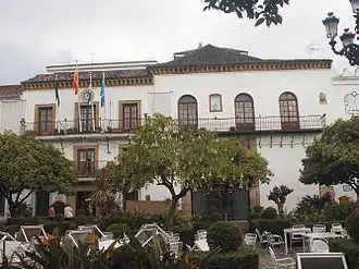 The Casa Consistorial De Marbella is a historic building in the city of Marbella, southern Spain, currently housing the city's town hall. Constructed in 1568 in the Renaissance style, it lies in the Plaza de los Naranjos in the city's historic district. The building's exterior includes a sundial and coat of arms, as well as memorial plaques written in Old Spanish to commemorate the conquest of the city in 1485 by Ferdinand and Isabella, the establishment of the city's water supply in 1632, and additions to the building in 1779.