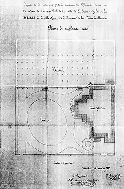The original site measured 30 × 34.5 m, with a surface area of 1035 m2.[12][note 5] The house had three facades, since on its northeast side there was a dividing wall shared with a neighbouring convent. Although the entrance was on the southeast side, facing Carrer Sant Gervasi, the main facade looked out onto the garden, on the southwest side, bordering the small street of Carreró Racó de Sant Gervasi, which was 35 × 3.5 m wide. The house, designed as a single-family home, had a wine cellar and basement for storage; a main floor with a foyer, dining room, porch, smoking room, kitchen and laundry room; a first floor with bedrooms, bathrooms, a dressing room and a library; an attic for staff accommodation; and a roof terrace with small walkways between the gables with chimneys and a pavilion in the northwest corner.[12] It had a Catalan vaulted staircase with wooden wainscoting on each step, decorated with small oil paintings by Torrescassana, which were lost in the renovations of 1925.[30]