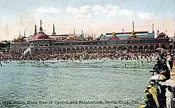 The Santa Cruz Railroad opened in 1874, but Santa Cruz did not immediately become a resort destination. The Santa Cruz Railroad became part of the Southern Pacific Railroad in 1881. Santa Cruz gained popularity as a resort in 1887, when the railroad shortened the line to Santa Cruz. Fred W. Swanton first built a casino, Neptune's Casino, and a beach tent city in 1904. The Casino offered 500 beach dressing rooms, a theater, a cafe, seaside grill, ballroom, and roof gardens. The Casino was designed by architect Edward L. Van Cleeck. The Casino was a bar with entertainment, but gambling was never legal there. However, it was widely known that visitors could find boats at the pleasure pier, now called the Santa Cruz Wharf, to take them out into the harbor to gamble in ships during the 1910s and 1920s. Swanton built an amusement park near the pier, sometimes referred to as the Coney Island of the West. In 1911, the Charles I. D. Looff family built a merry-go-round carousel and in 1924, the Giant Dipper roller coaster.. Both the Santa Cruz Looff Carousel and Roller Coaster are National Historic Landmarks.[4][5] The Casino changed its name to Cocoanut Grove from 1920 to 1933 during prohibition. On June 22, 1906, a fire started in the kitchen and destroyed the entire casino. Swanton hired William Henry Weeks to design a new Casino and the Plunge Natatorium pools. At the same time, a new Cottage City was built for guests. The new Casino, Plunge, and Cottage attracted many new guests to the Santa Cruz Beach Boardwalk by the end of 1907. The Cottage City was designed as a residential hotel for long summer stays, but there was a need for a regular hotel. The hotel was served by Horsecars that offered tram service starting in 1876. The Santa Cruz, Garfield Park, and Capitola Electric Railroad provided service in 1881. The Union Traction Company consolidated the three electric tram service routes in 1904. One service line ran from DeLaveaga Park along Water Street and Pacific Avenue to the beach. Another ran from Ocean Cliffs to the hotel along what would become CA Route 1. The third line through Seabright to Capitola was completed in 1906. With the increasing use of automobiles, the streetcar service ended in 1926. The Southern Pacific Railroad ran a summer excursion train, called the Suntan Special, between San Francisco and the hotel from 1927 to 1959.[6][7][8] The ballroom in the Casino has hosted nightly bands and dances since its opening. In 1924, Isham Jones's band played jazz. In the 1930s and into the 1950s, Big Bands and jazz artists played, including: Artie Shaw, Ted Fio Rito, Lawrence Welk, Benny Goodman, Skinnay Ennis, Paul Whiteman, Billy May, Tex Beneke, Les Elgart, Hal McIntyre, and Si Zentner. In the 1960s, the ballroom featured artists such as Nat King Cole, Sonny and Cher, the New Christy Minstrels, and The Four Freshmen.[9][10] From 1924 to 1965, the Miss California Pageant took place at the Casino's Boardwalk.[11] Many movies and TV shows have been filmed on the Casino's Boardwalk, including: Sudden Impact, Mr. Peabody and the Mermaid, America Screams, and The Lost Boys.[12]