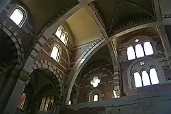 Adjoining the tower is the church of Santo Stefano which stands on the east side of a small square named after it. The church's origins date to the beginning of the second millennium, but it was largely rebuilt in the mid-17th century under a project attributed to Sebastiano Guala; work on the current façade began in 1787 but was not completed until the late 19th century. Inside are paintings by Giovanni Francesco Caroto (1480–1555), Il Moncalvo (1568–1625), Giorgio Alberini (1575/6 – 1625/6), and Francesco Cairo (1607–1665). Adorning both the walls and the vault are 15 tondi depicting prophets, apostles and the Virgin painted by Pietro Francesco Guala in 1757, the last year of his life.