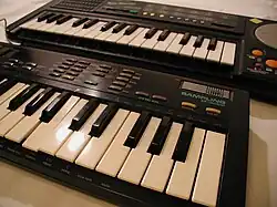 The Casio SK-1 is a small sampling keyboard made by Casio in 1985.[1][2] It has 32 small sized piano keys, four-note polyphony, with a sampling bit depth of 8 bit PCM and a sample rate of 9.38 kHz for 1.4 seconds, a built-in microphone and line level and microphone inputs for sampling, and an internal speaker and line out. It also features a small number of four-note polyphonic preset analog and digital instrument voices, and a simple additive voice.