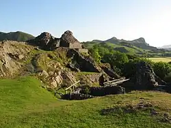 Castell y Bere was built in the 1220s by Llywelyn the Great on a rocky hillock overlooking the Dysynni Valley, near Llanfihangel-y-pennant.[1] Traditionally the Welsh princes had not constructed castles, instead using undefended palaces called llysoedd, or courts.[2] From the late 11th century onwards, the Normans had advanced into Wales, taking lands in the north and establishing a band of occupied territory in the south called the Welsh Marches. During the 12th century some timber and earthwork castles began to be built, but in small numbers.[3]