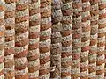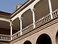 The castle was constructed under the supervision of a Moorish architect and engineer. Such Moorish engineers were routinely commissioned to construct large buildings during the medieval times and were called "Alarife" (one who understand the art of construction).[6] Brick was used for most of the construction. However, the bricks used in the castle are different from ordinary bricks used to build houses. These are hardened bricks that are capable of withstanding enemy onslaught during sieges.[7] The bricks were laid smooth with the mortar, so the lines of the brickwork are clearly visible along with the mortar. This created a distinctive pattern on the castle. The castle was constructed in classic Mudéjar fashion. Brickwork and plaster work was used to create geometrical patterns depicting a hybrid of Moorish Muslim and Christian Gothic architecture. While the main construction is of brick, limestone and plaster were used in the balistraria and embrasures. White limestone was also used to decorate columns in the courtyard and the keep, as well as numerous other features on the facade of the keep.[8]