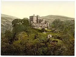 Castle Campbell was originally known as Castle Gloom. The name was possibly derived from the Scottish Gaelic: glom meaning a "chasm", and referring to the narrow gorges to either side of the site.[1] The naturally defended position may have been the site of a motte in the 12th century. The present tower was built around 1430 for John Stewart, Lord Lorne (d.1463), or one of his kinsmen.[2] In about 1460, the property was acquired by Colin Campbell, 1st Earl of Argyll (d.1493) during his marriage to Isabel Stewart, Lord Lorne's daughter. [3] The first historical record of the castle dates from the following year, when Pope Paul II issued a bull against Walter Stewart, son of Lord Lorne, for attacking and damaging the "Place of Glom". At the time, Campbell, who was at the papal court, might have played a key role in organizing the Pope's involvement. The tower shows signs of early rebuilding following this episode.[2]