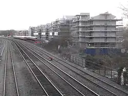Castle Mill is located north of Oxford railway station along Roger Dudman Way, just to the west of the railway tracks and the Oxford Down Carriage Sidings, on what was formerly Cripley Meadow, south of Port Meadow.[1] The initial buildings at the southern end of the site were completed in 2004.[2] Accommodation is available for single people, couples, and families.[3] Graduate students with children benefit from priority access to lower-cost accommodation, alleviating the over-stretched housing market in Central Oxford.[4]