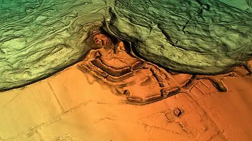 The earthworks at the site are larger than would normally be found in a castle from the Norman period, raising speculation that it reused previously developed features.[4]