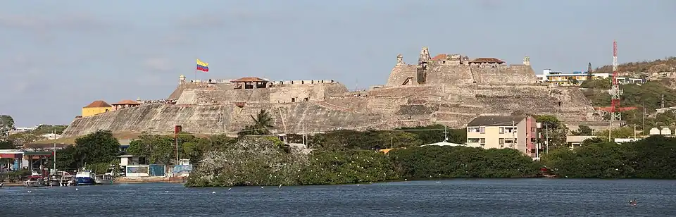 The Castillo San Felipe de Barajas (San Felipe de Barajas Castle) is a fortress in the city of Cartagena, Colombia. The castle was built in 1639 and is located on the Hill of San Lázaro in a strategic location, dominating approaches to the city by land or sea. It was originally known as the Castillo de San Lázaro. It was built by African slave labor under Spanish supervision during the colonial era.[1] The fortress was involved in several battles between the late 17th to early 19th centuries between European powers.