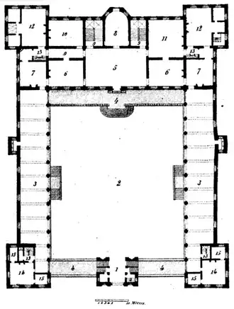 The castle of Ronse was a U-shaped palace in late renaissance style on a square plan of 58 metres by 72 metres in five stories, consisting of a gatehouse, a central courtyard with an extensive residential wing and a chapel at the rear, two side wings, and four corner towers with a height of 37 meters.[1] The castle was constructed of red brick with natural stone elements such as windows, arcades, profiled moldings, and corner blocks. The arrangement of the rooms was almost symmetrical, with two large apartments in the corners and the main public spaces, the entrance gate, and the chapel, on the central axis. The chapel was two stories high and featured a gallery on the first floor and an extended apse in the middle of the rear facade. The grand salon was located on the floor above the hall and opened onto the chapel.