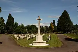 The cemetery has a Commonwealth War Graves (CWGC) section, marked by a Cross of Sacrifice made to the standard design devised by Reginald Blomfield. The section was established in the First World War, when Cardiff's nearby main hospitals treated numerous servicemen who had been wounded in action, or who contracted influenza in the 1918–19 influenza pandemic.