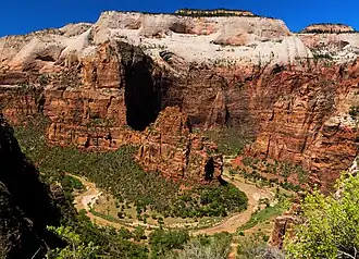 Cathedral Mountain is situated at the north end of Zion Canyon, towering 2,500 feet (760 meters) above the canyon floor and the North Fork of the Virgin River which drains precipitation runoff from this mountain. Cathedral is the nearest higher neighbor to Angels Landing, with 0.7 miles (1.1 km) of separation, and the Angels Landing Trail traverses Refrigerator Canyon between them.[4] Other neighbors include The Great White Throne, Observation Point, The Organ, Lady Mountain, Cable Mountain, and parent Mount Majestic. This feature's descriptive name was applied by Stephen S. Johnson in 1922, and officially adopted in 1934 by the U.S. Board on Geographic Names.[3][5] The Spearhead, elevation 5,804-ft, is the southernmost tip of this mountain, and is prominently featured from Zion Lodge.[6] The first ascent of Cathedral was made by Walter Becker, Fritz Becker, and Rudolph Weidner on August 31, 1931.[7]