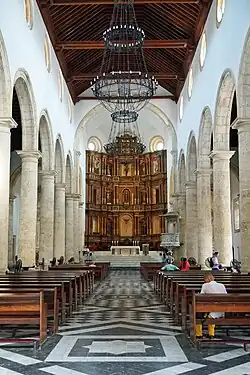 The current cathedral concerns the third building built as a cathedral church in the city. The first one was promoted by the Dominican friar Tomás de Toro y Cabrero, first bishop of Cartagena, and who was named by Pope Paul III. The construction of the temple began in 1535, only two years after the founding of the city, and ended in 1537.[4] It was a humble construction of "thatched roof and reeds", and was located in the block that is behind the present cathedral, with front on the street calle del Coliseo. The life of this building was short, for in 1552 a fire consumed much of the city and in ruins, the cathedral was converted.[4] In its replacement, between 1563 and 1568, the construction of the second cathedral temple was carried out, realized in wood and of thatched ceiling, because were difficult times and it did not have many resources, but was more solid than the previous one. From this second temple, a modest trace is preserved in the General Archive of the Indies and a physical remnant of its bulrush.[4]