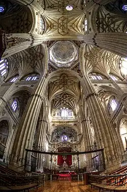 The original dome was erected by Joaquín de Churriguera when the works were resumed, after being stopped for almost the entire 17th century, due to lack of budget. It was finished in 1725 and it seems that it was similar to that of the Cathedral of Burgos, with ribs and baroque decoration. The earthquake of Lisbon in 1755 cracked the central dome and replaced it with another Neoclassical one made by the architect Juan de Sagarvinaga, which is the one that can be seen today.