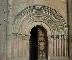 Further east, we find the Puerta del Mercado, formerly "Puerta de La Cadena", which overlooks the Plaza Mayor, Romanesque style, from the 12th century; this door is covered by a closed portico, Neoclassical style, built in 1797 by the architect Bernasconi commissioned by the bishop Juan Díaz de la Guerra. On the portal, a Romanesque rose window of transition, from the 13th century, with a very original tracery design.[10]